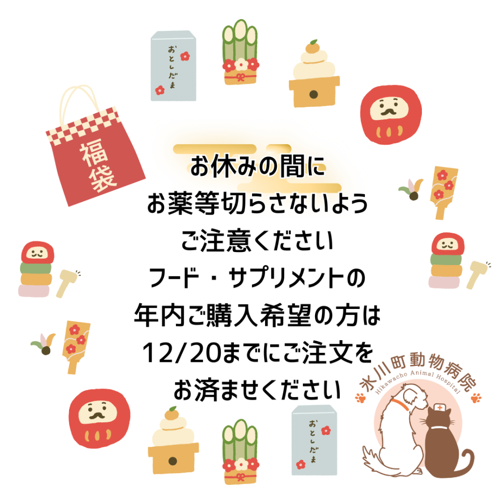 フード・サプリメントの年内ご購入希望の方は、2025年12月20日(土)までにご注文をお済ませください。そのお日にち以降のご注文は、フード・サプリメントのお渡しが年明けとなる場合がございます。