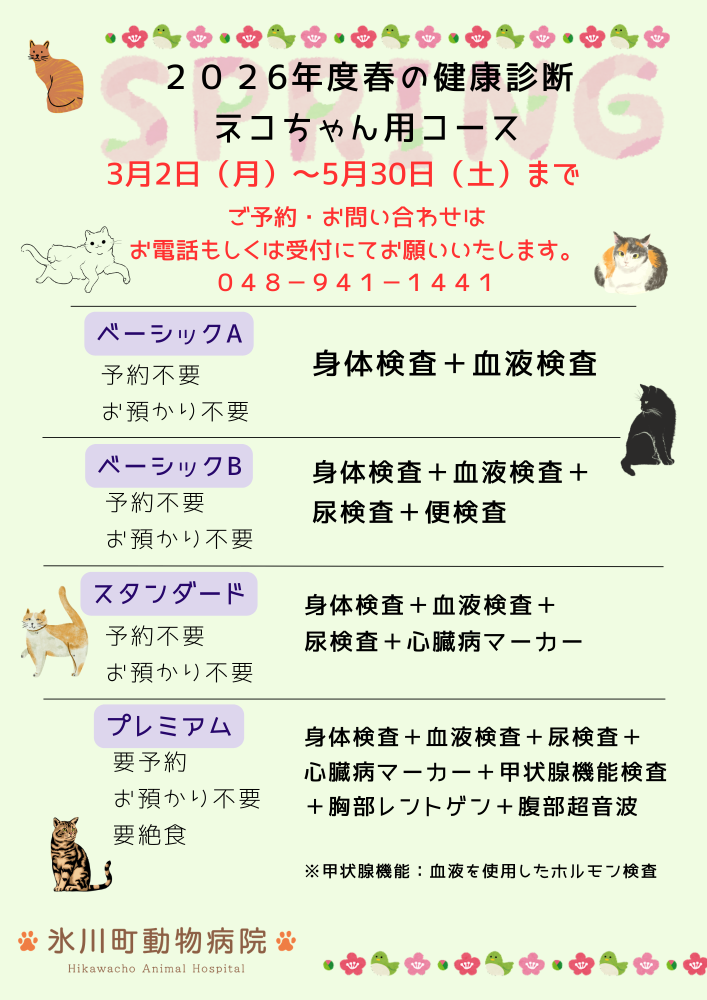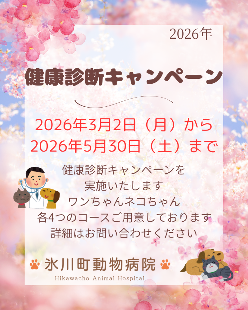 こんにちは。草加市の氷川町動物病院です。2026年3月2日(月)より、春の健康診断キャンペーンがはじまります。予約なしでも受けていただけるものなど、ワンちゃんネコちゃん各種コースをご用意しております。この機会に是非ご利用ください。コース詳細に関するお問い合わせや、予約が必要なコースは、お電話にてお問い合わせください。氷川町動物病院〒340-0044埼玉県草加市花栗2-6-12 048-941-1441