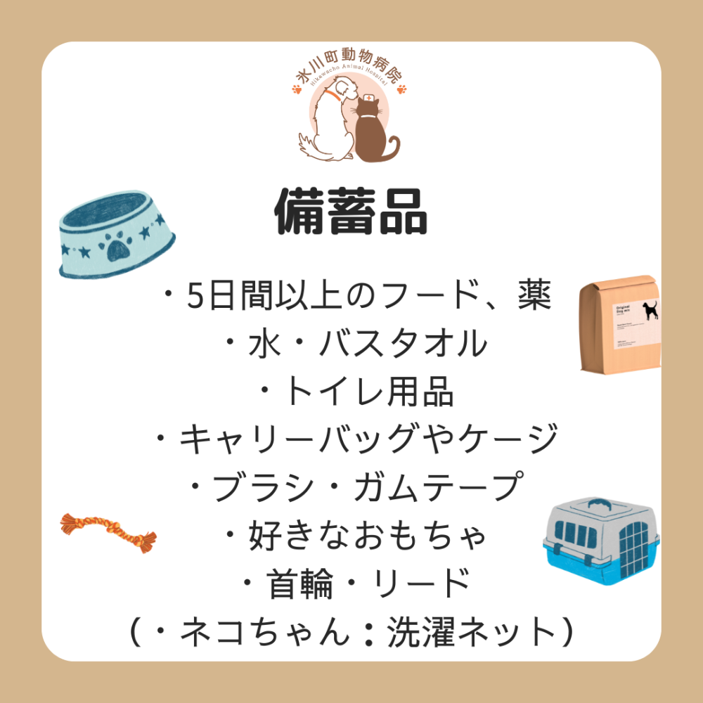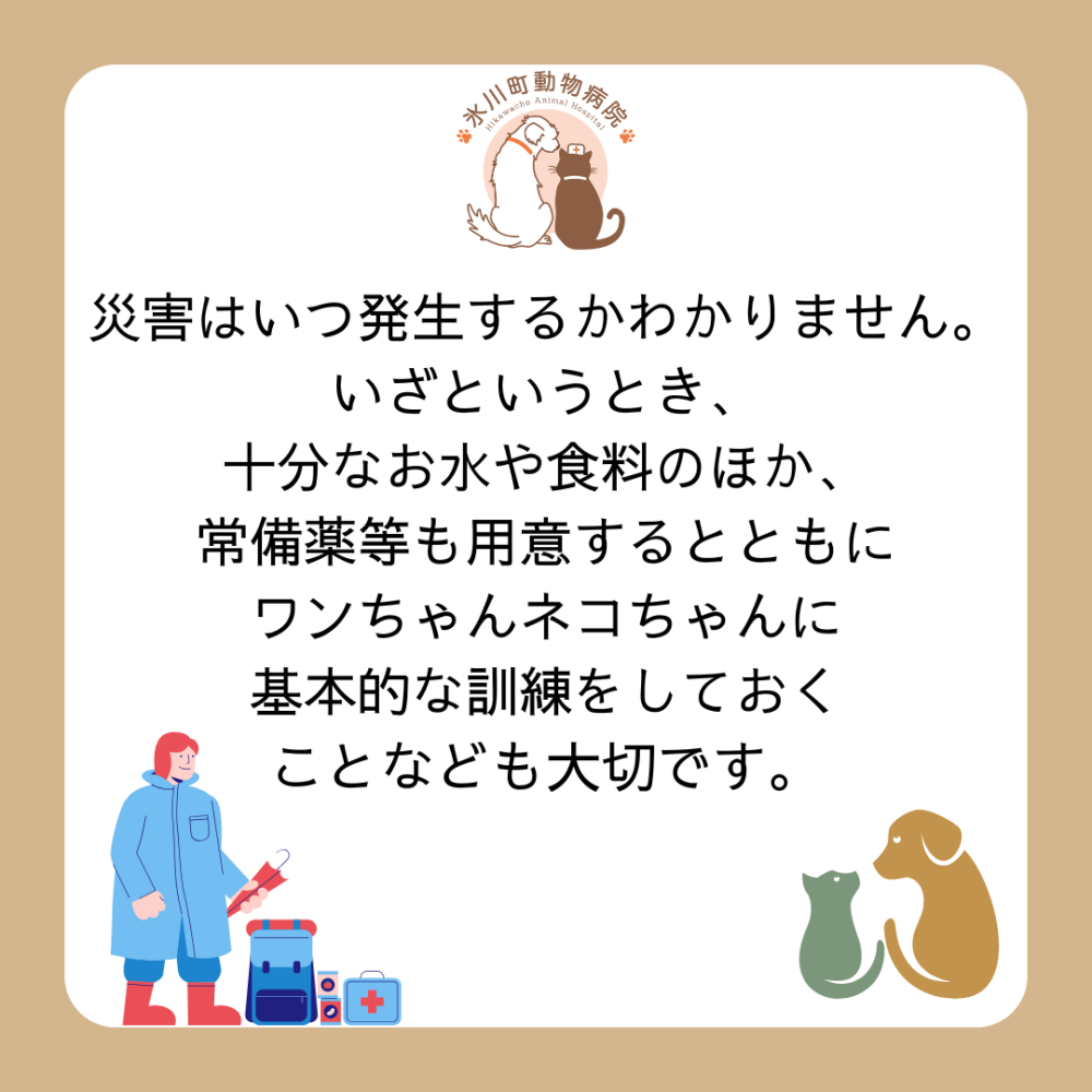 災害はいつ発生するかわかりません。いざというとき、十分なお水や食料のほか、常備薬等も用意するとともにワンちゃんネコちゃんに基本的な訓練をしておくことなども大切です。