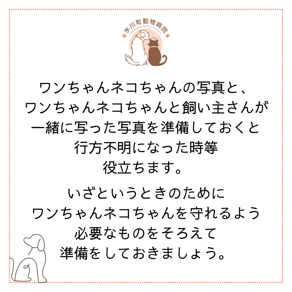 ワンちゃんネコちゃんの写真と、ワンちゃんネコちゃんと飼い主さんが一緒に写った写真を準備しておくと行方不明になった時等役立ちます。