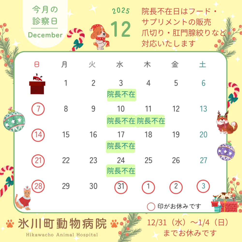 12月の診療日のお知らせを11月19日にラインご登録の方に配信させていただきましたが、訂正がありましたのでお知らせいたします。2025年12月3日(水)・12月10日(水)・12月11日(木)・12月17日(水)・12月24日(水)は終日院長不在となります。フード・サプリメントの販売、爪切り・肛門腺絞りなど対応いたします。年末年始は12月31日(水)から1月4日(日)までお休みです。氷川町動物病院