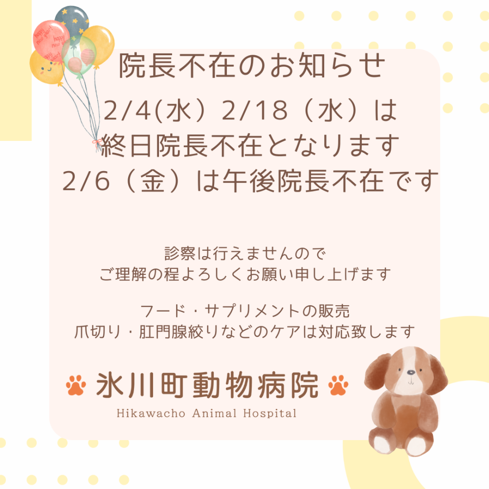 2/4(水)・2/18(水)は 終日院長不在、2/6(金)は午後院長不在