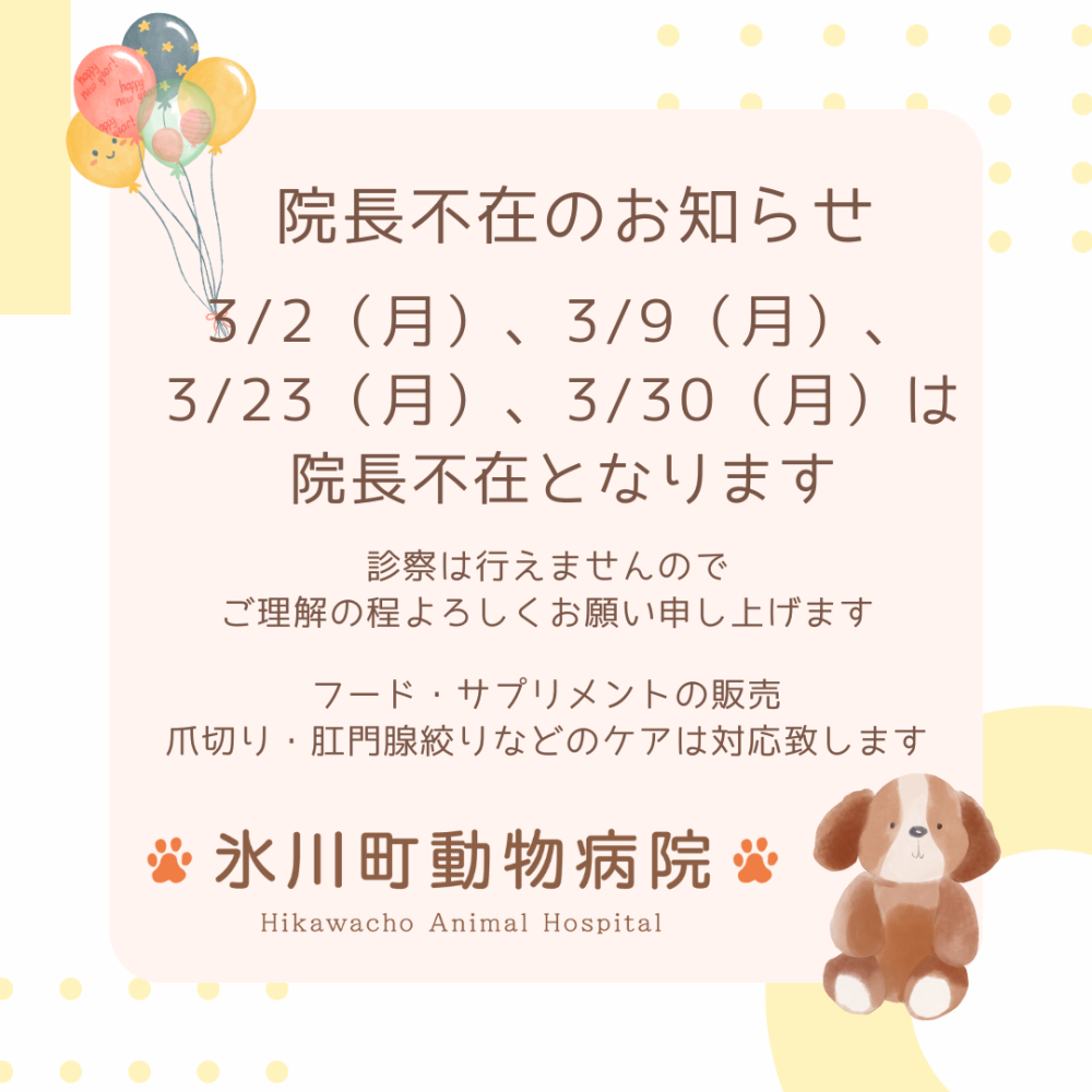 3/2(月)・3/9(月)・3/23(月)・3/30(月)は 終日院長不在となります
