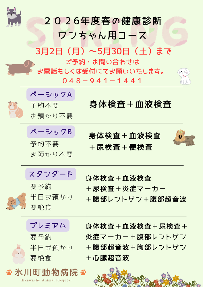 こんにちは。草加市の氷川町動物病院です。2026年3月2日(月)より、春の健康診断キャンペーンがはじまります。予約なしでも受けていただけるものなど、ワンちゃんネコちゃん各種コースをご用意しております。この機会に是非ご利用ください。コース詳細に関するお問い合わせや、予約が必要なコースは、お電話にてお問い合わせください。氷川町動物病院〒340-0044埼玉県草加市花栗2-6-12 048-941-1441