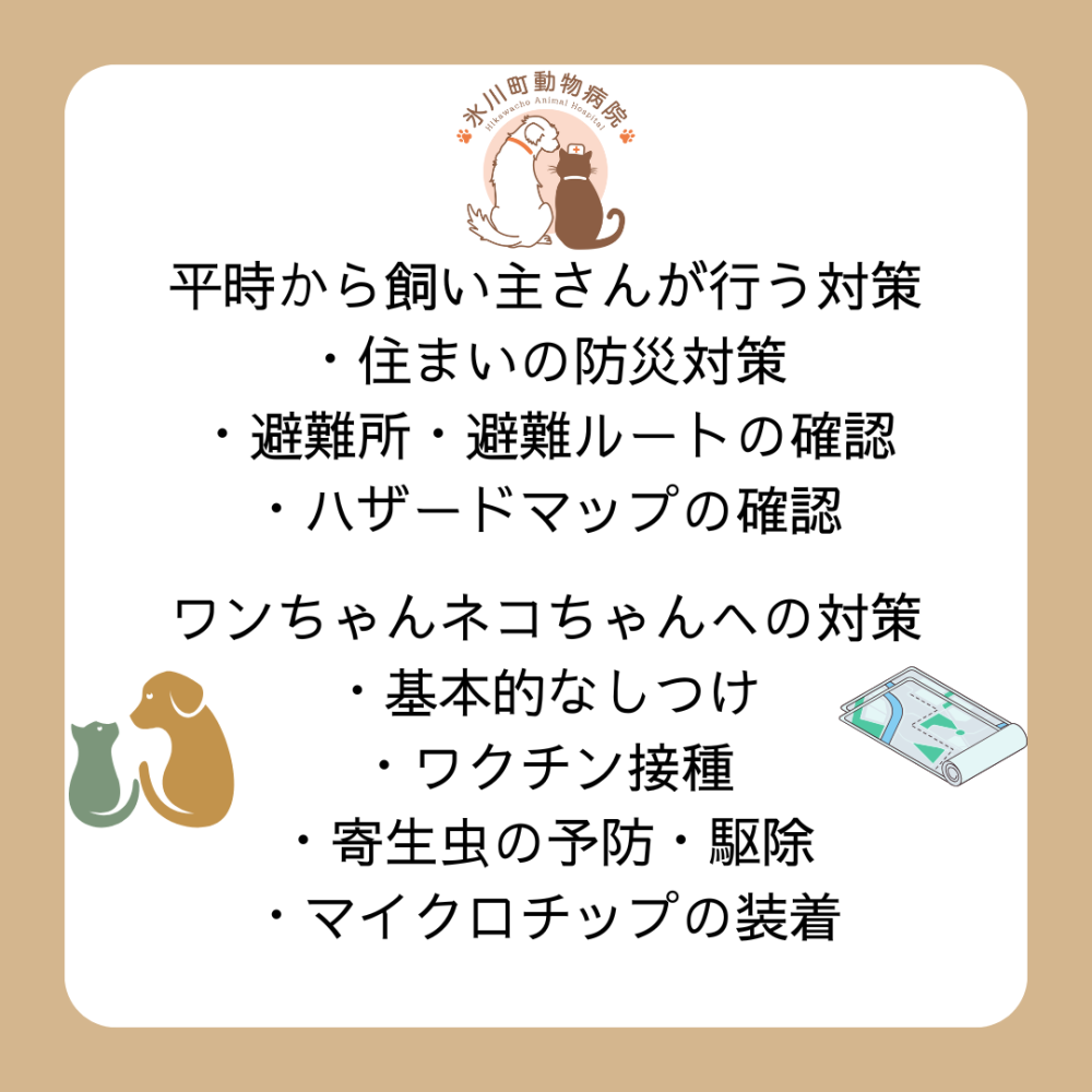 災害はいつ発生するかわかりません。いざというとき、十分なお水や食料のほか、常備薬等も用意するとともにワンちゃんネコちゃんに基本的な訓練をしておくことなども大切です。